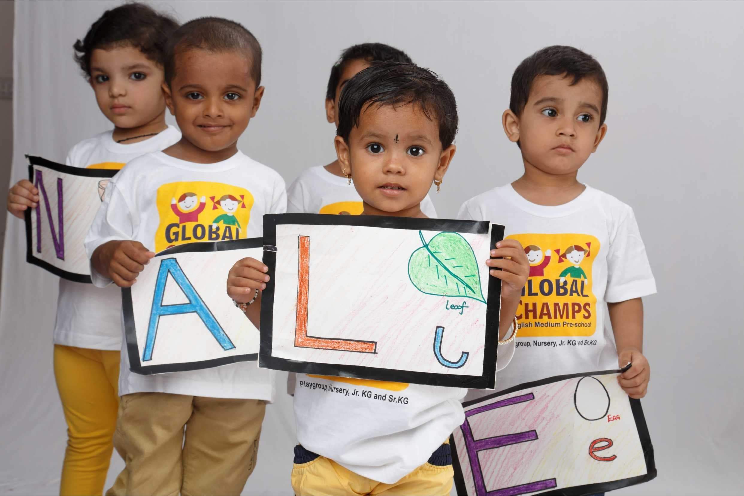 "Global Champs” as a brand stands for its best and innovative standards, which are an ensemble of professional setups, trained and experienced teachers and the use of contemporary teaching strategies. We try to link the child’s home environment to the classroom activities. The Play way and Montessori methods undertaken at “ The Global Champs’ help a child to develop Confidence, Self-Reliance, Discipline and also help to develop the distinctiveness of each child’s personality. Our team continuously works to bring in the latest whether it is curriculum, or theme-based learning or the activities which help faster assimilation of learning and experience.